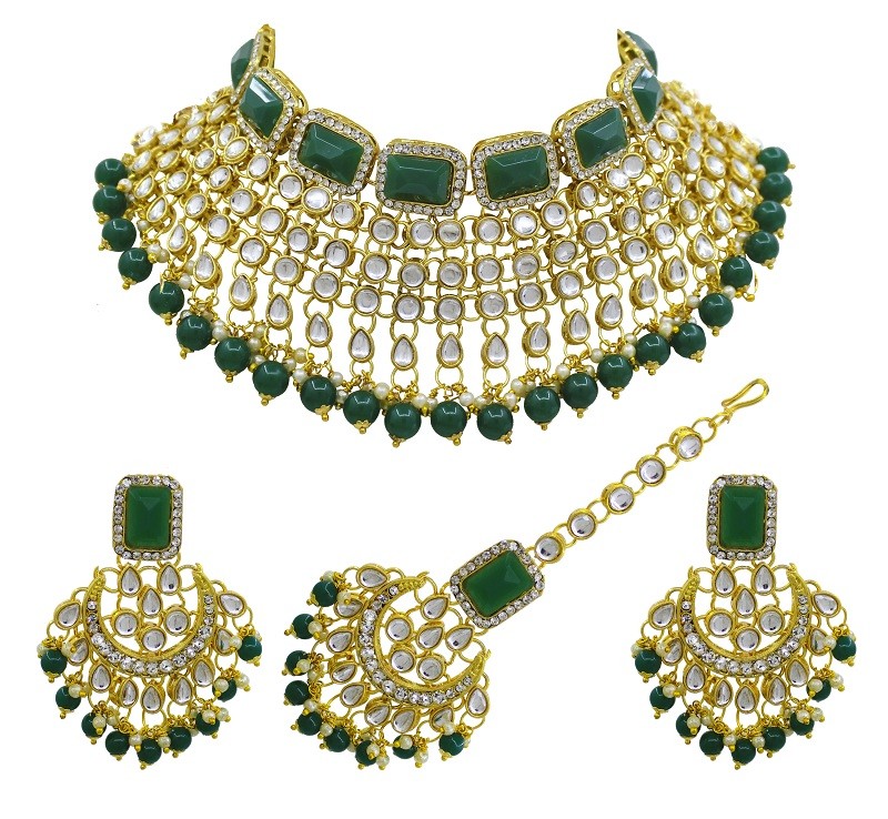 Kundan Gold Plated Choker Necklace Set for Women will complement any Indian attire. Necklace Length - 19 cm| Necklace Width - 6 cm| Earring Length - 7 cm| Earring Width - 5 cm. Maangtikka Length -13 cm| Maangtikka Width -6 cm..